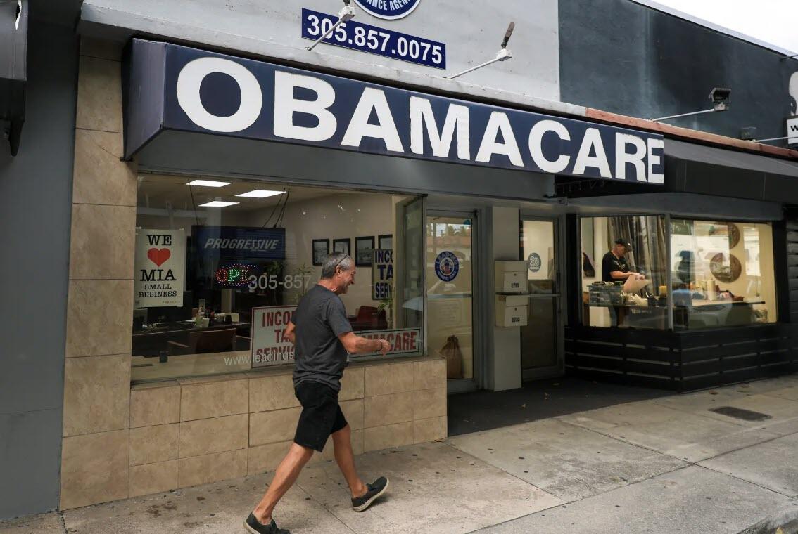 An Obamacare sign is displayed outside an insurance agency in Miami on Nov. 12, 2025. Data show enrollment has surged since enhanced tax credits began in 2021, roughly doubling over five years. Joe Raedle/Getty Images