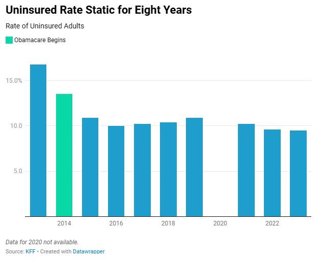 That didn’t happen. By 2019, enrollment had plateaued at around 11.4 million, and about 11 percent of adults remained uninsured.