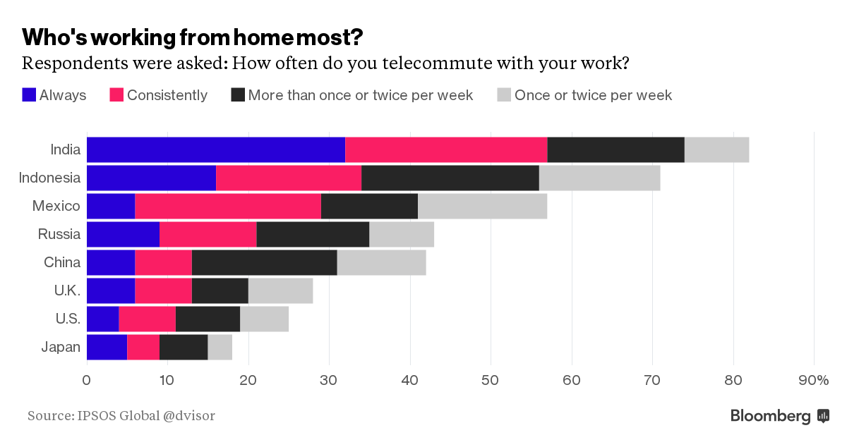 There isn’t much data on global trends. A poll of more than 18,600 people in 26 countries published by Ipsos in 2012 named India, Indonesia and Mexico as the top countries for telecommuting, followed by South Africa, Turkey and Saudi Arabia. Ten percent to 35 percent of the world’s workforce worked remotely at least once or twice per week, the report found.