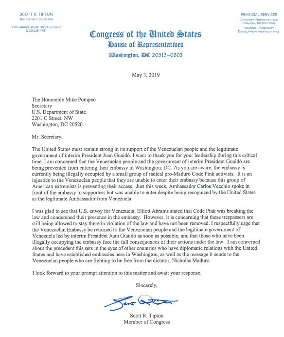 Colorado Republican Rep. Scott Tipton sent a letter to Secretary of State Mike Pompeo Friday requesting that members of radical activist group Code Pink be removed from the Venezuelan embassy in Washington, D.C., which they have apparently occupied for the last several weeks.
