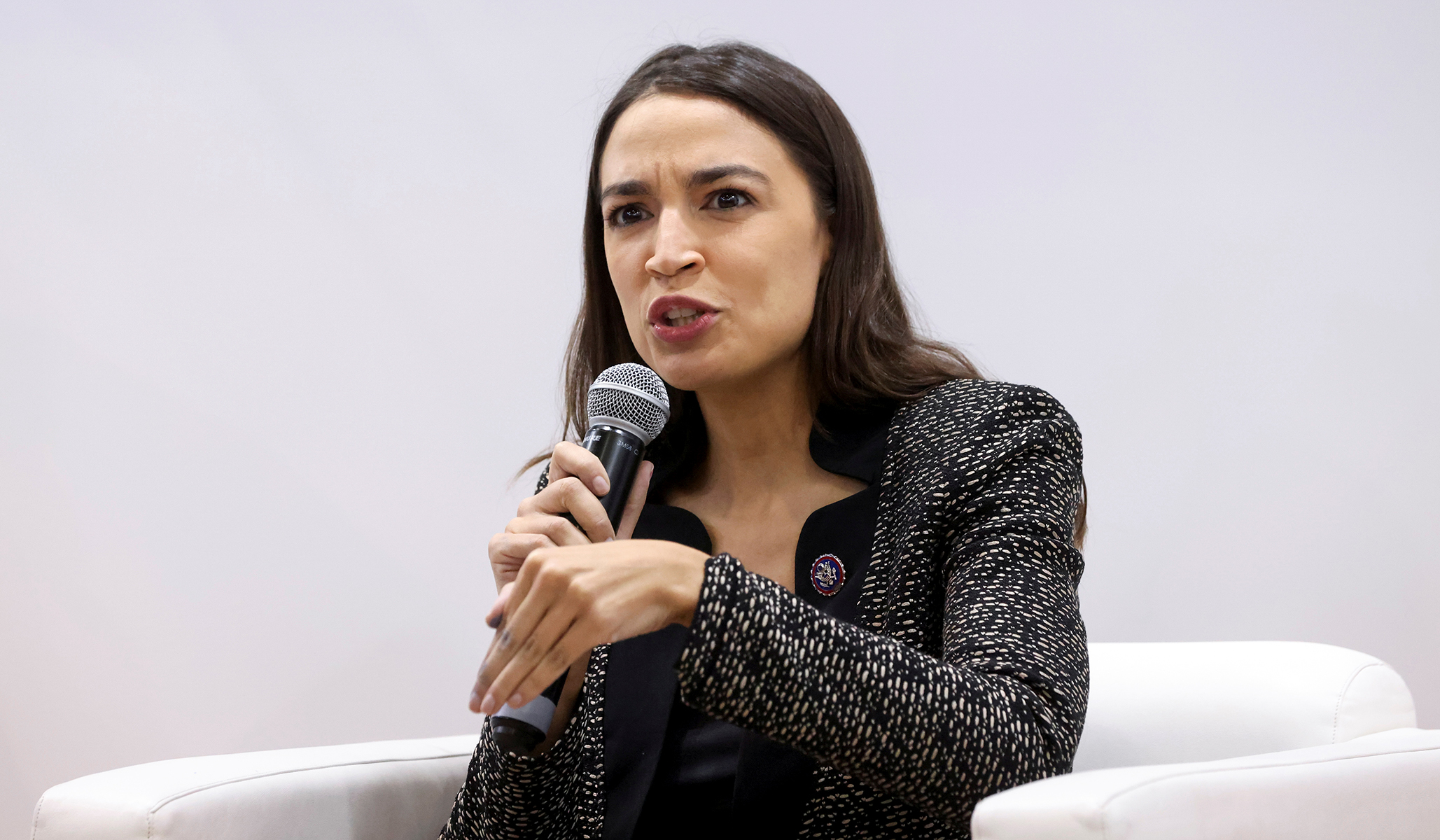 Representative Alexandria Ocasio-Cortez addresses a panel in the U.S Climate Action Center during the UN Climate Change Conference (COP26) in Glasgow, Scotland, November 9, 2021. (Yves Herman/Reuters)