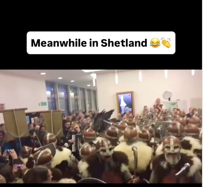 Shetland Islanders are gearing up for battle in Nordic battle dress. So, it’s going to be funny as well.