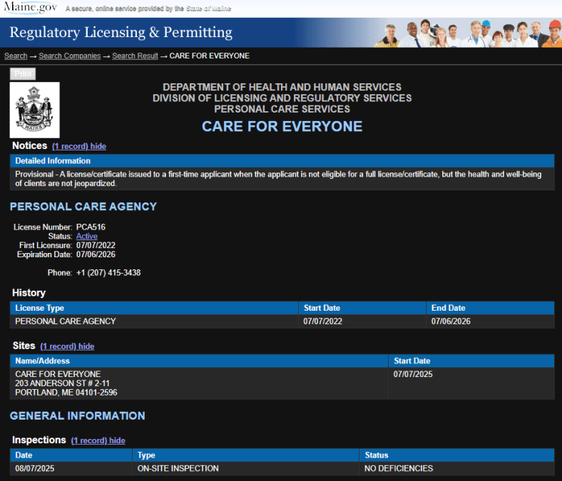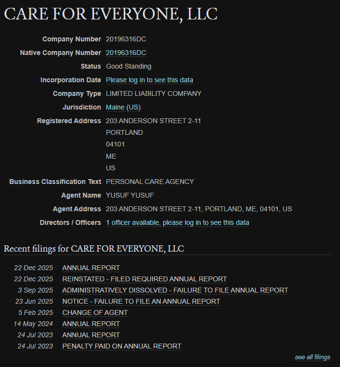 Yusuf’s ethics filing and DHHS Medicaid payment data list Care for Everyone’s address as 49 Dartmouth Street, Portland, but business records from OpenCorporates and records from the DHHS Division of Licensing and Regulatory Services place the business at 203 Anderson Street, Portland.