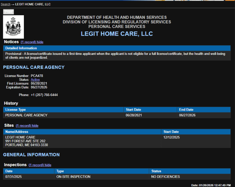 In October 2022, MaineCare’s Office of Program Integrity sent Legit Home Care a notice of violation, ordering it to repay $39,804.06 after auditors found that it failed to provide proper documentation for some of its services.