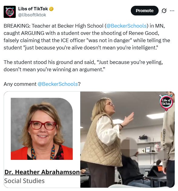 Heather Abrahamson, a teacher at Becker High School, was exposed by LoTT after we published a video of her ARGUING WITH and INSULTING a student’s intelligence over the shooting of Renee Good by ICE.