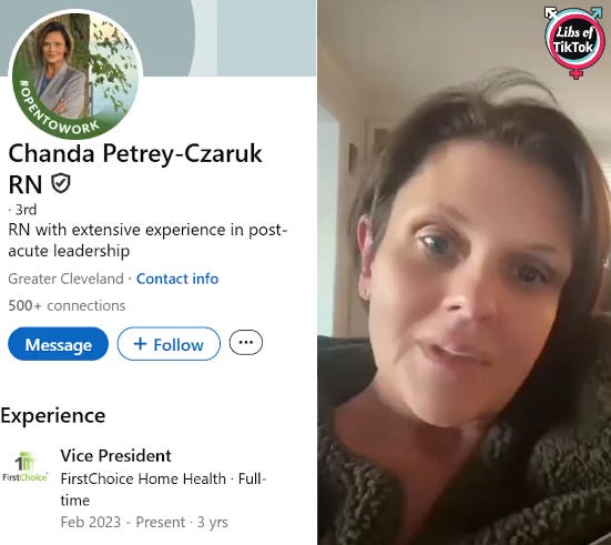 Chanda Petrey-Czaruk, the former VP of FirstChoice Home Health, was exposed after we published a video of her wishing for Press Secretary Karoline Leavitt to experience traumatic injuries during childbirth.