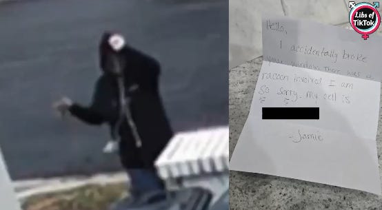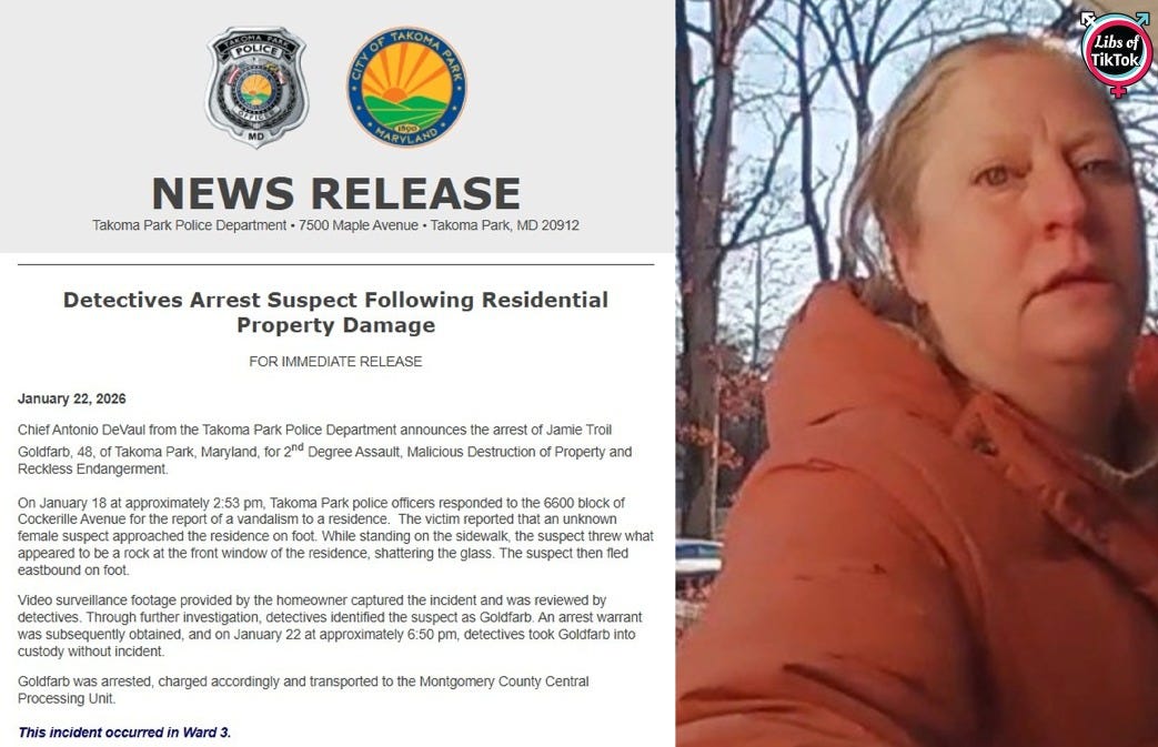 Libs of TikTok obtained footage from Takoma Park, MD, which appeared to show a woman throwing a large rock through the window of a family’s home. The home had a Charlie Kirk flag prominently displayed outside. The rock nearly hit a child in the house.